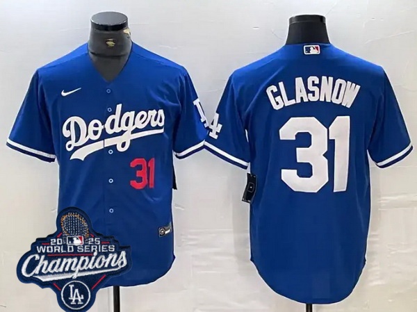 Men Los Angeles Dodgers 31 Tyler Glasnow Cool Base 2025 World Champions Stitched Baseball Jersey Blue